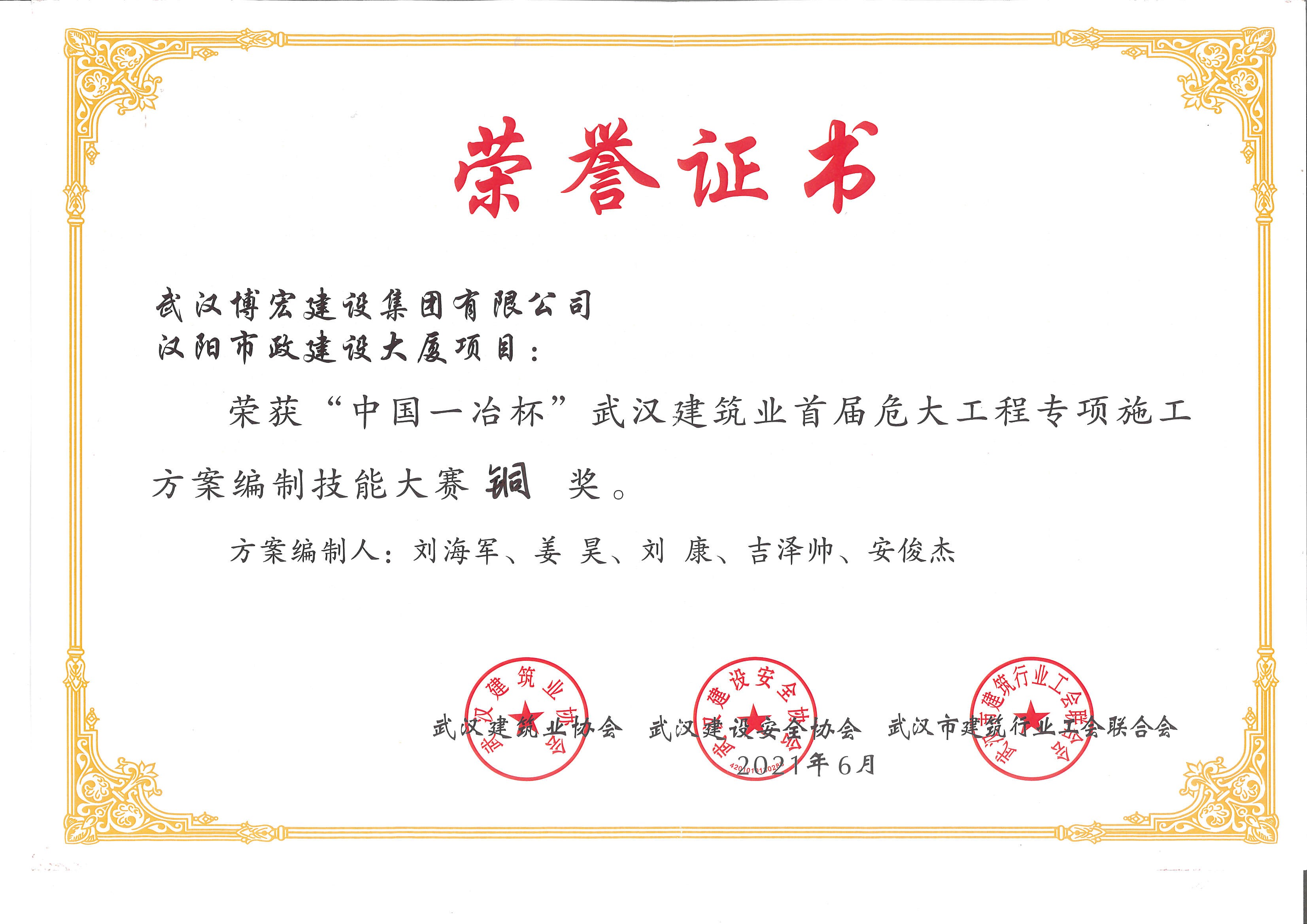 中國一冶杯武漢建筑業(yè)首屆危大工程專項施工方案編制技能大賽銅獎