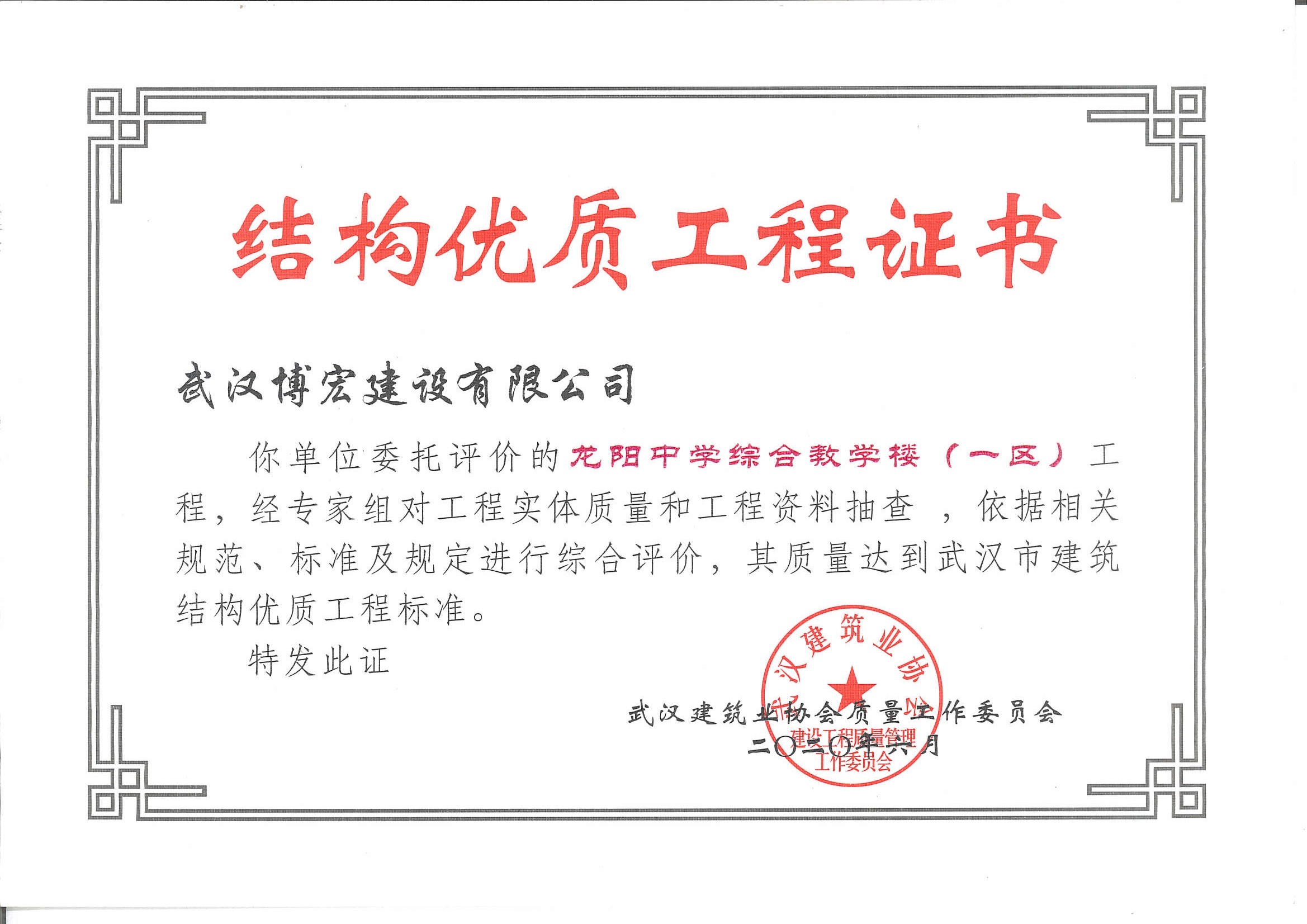 優(yōu)質(zhì)工程證書(武漢四新中學(xué)建設(shè)項目工程(1、2號學(xué)生公寓及食堂)