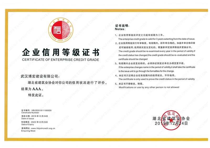 武漢建筑業(yè)信用企業(yè)等級(jí)證書