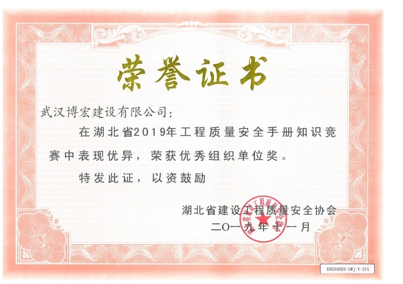 湖北省2019年工程質(zhì)量安全手冊(cè)競(jìng)賽優(yōu)秀組織單位獎(jiǎng)