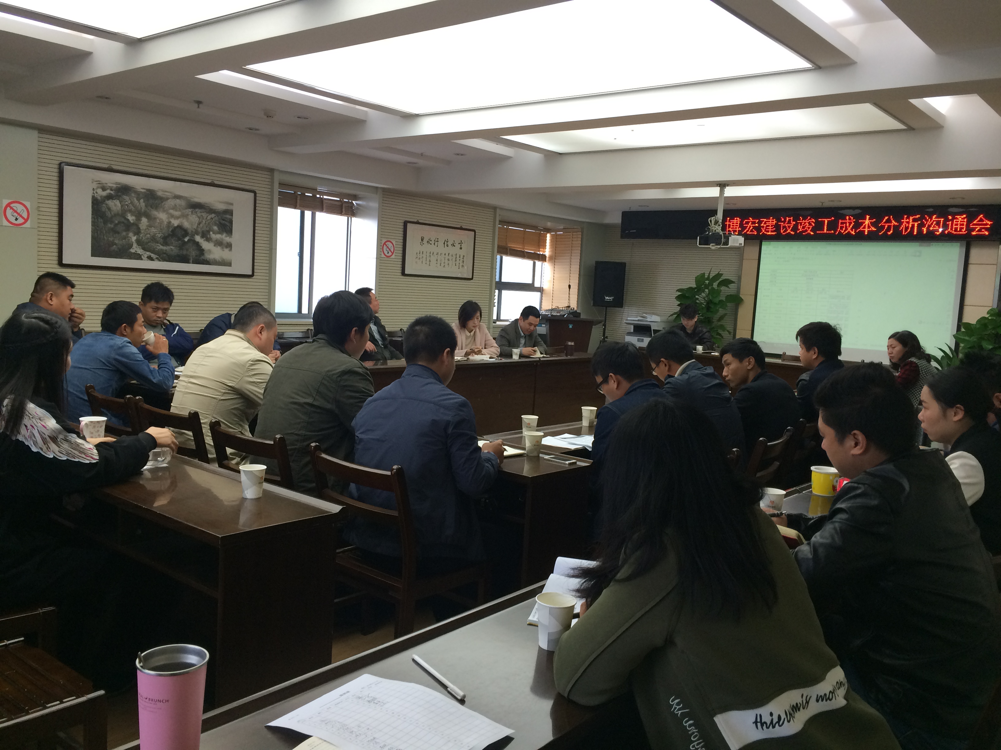 為了進一步促進成本、合同、結(jié)算管理工作,博宏公司造價部于2016年10月27日上午9點在公司會議室召開悅城、芳草小學(xué)等7個項目的成本分析會,總經(jīng)理、支部書記、全體項目經(jīng)理、預(yù)算員以及造價部全體人員參加了本次會議。