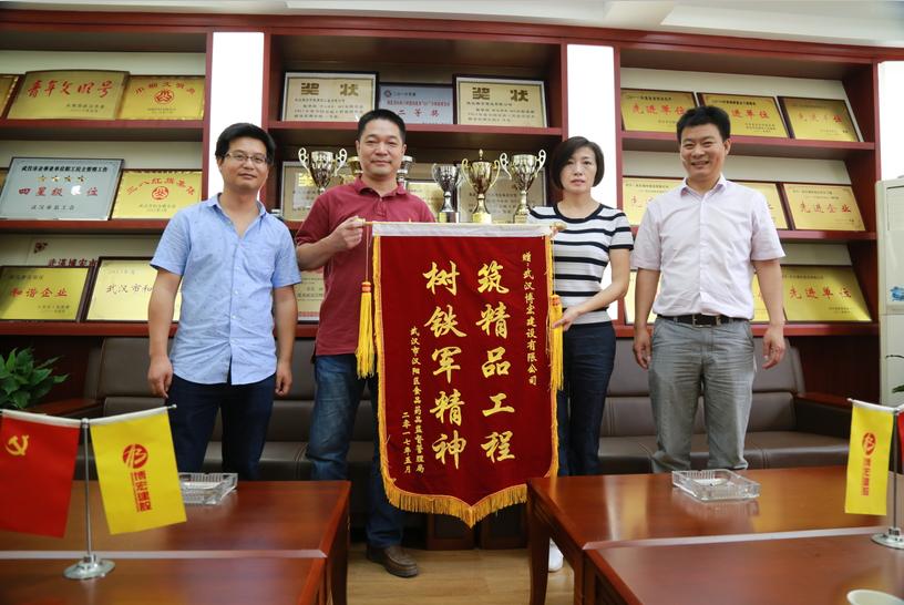 努力成就未來,精品贏得榮譽!6月14日,因金龍公館4-7樓裝修改造工程建設又快又好,漢陽區(qū)食品藥品監(jiān)督管理局辦公室主任馬濤專程到訪博宏建設,送來錦旗一面表示感謝!