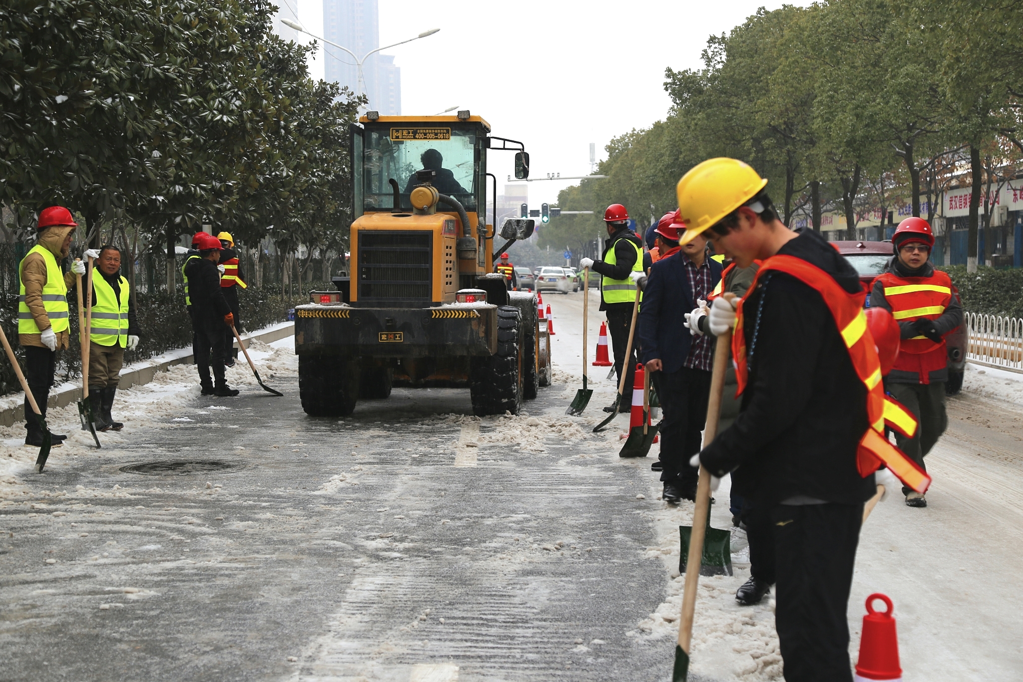 本次行動(dòng)中公司出動(dòng)人員160余人,正鏟車7臺(tái),防凍手套、反光背心、礦泉水等物資一應(yīng)俱全,董事長(zhǎng)兼總經(jīng)理錢濤親自帶隊(duì)指揮,領(lǐng)導(dǎo)班子集體出動(dòng)來(lái)到一線參與除雪,部分干部職工更是不顧個(gè)人感冒的身體情況,堅(jiān)持親自參與除雪,并駐守現(xiàn)場(chǎng)指揮調(diào)度。這次行動(dòng)中,無(wú)論是老職工還是新員工,大家手腳齊用,人車并進(jìn),熱情高漲。氣溫雖寒,道路雖長(zhǎng),但架不住博宏建設(shè)廣大職工高漲的熱情與高效的作業(yè),截止當(dāng)天下午6點(diǎn),琴臺(tái)大道全線單邊除雪基本完成,車輛通行無(wú)阻。