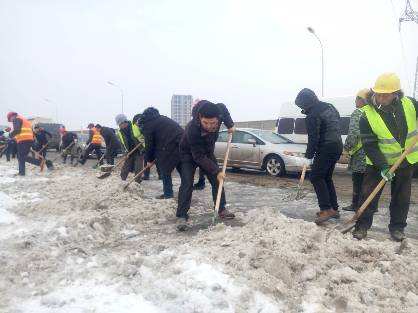 1月28日,公司廣大職工不畏低溫嚴(yán)寒,來(lái)到三環(huán)線(龍陽(yáng)大道~漢陽(yáng)大道)路段,繼續(xù)奮戰(zhàn),男女齊上陣。期間,漢陽(yáng)區(qū)委書記馬澤江、集團(tuán)公司董事長(zhǎng)嚴(yán)悌文等領(lǐng)導(dǎo)來(lái)到現(xiàn)場(chǎng)指揮工作,為廣大建設(shè)者鼓勁兒加油,下午2點(diǎn),基本完成主干道清掃,車輛予以通行,截至5點(diǎn),徹底完成三環(huán)線(龍陽(yáng)大道~漢陽(yáng)大道)路段的積雪清掃工作。隨后,鏟雪隊(duì)伍搶抓時(shí)間,來(lái)不及休息便再一次來(lái)到琴臺(tái)大道對(duì)昨夜的積雪進(jìn)行二次清除,進(jìn)一步拓寬快車道,下午6點(diǎn)30分完成拓寬任務(wù)。