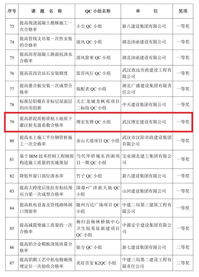 每年,公司都根據(jù)各大在建項目的實際情況,針對生產中的難題,從挖潛增效、強化管理等角度確定課題,成立相關技術攻關小組,構思切實可行的質量提升措施,并邀請技術專家對其進行指導完善。本次獲得一等獎的《提高淤泥質粉質粘土地質下灌注樁充盈系數(shù)合格率》,在其攻關過程中,“博宏先鋒 QC 小組”制定了嚴格的工作計劃和科學的攻關流程,按月推進,最終形成了一套可復制、可推廣的工作經(jīng)驗,攻關小組也通過QC活動掌握了一套提升項目管理質量的方法論。