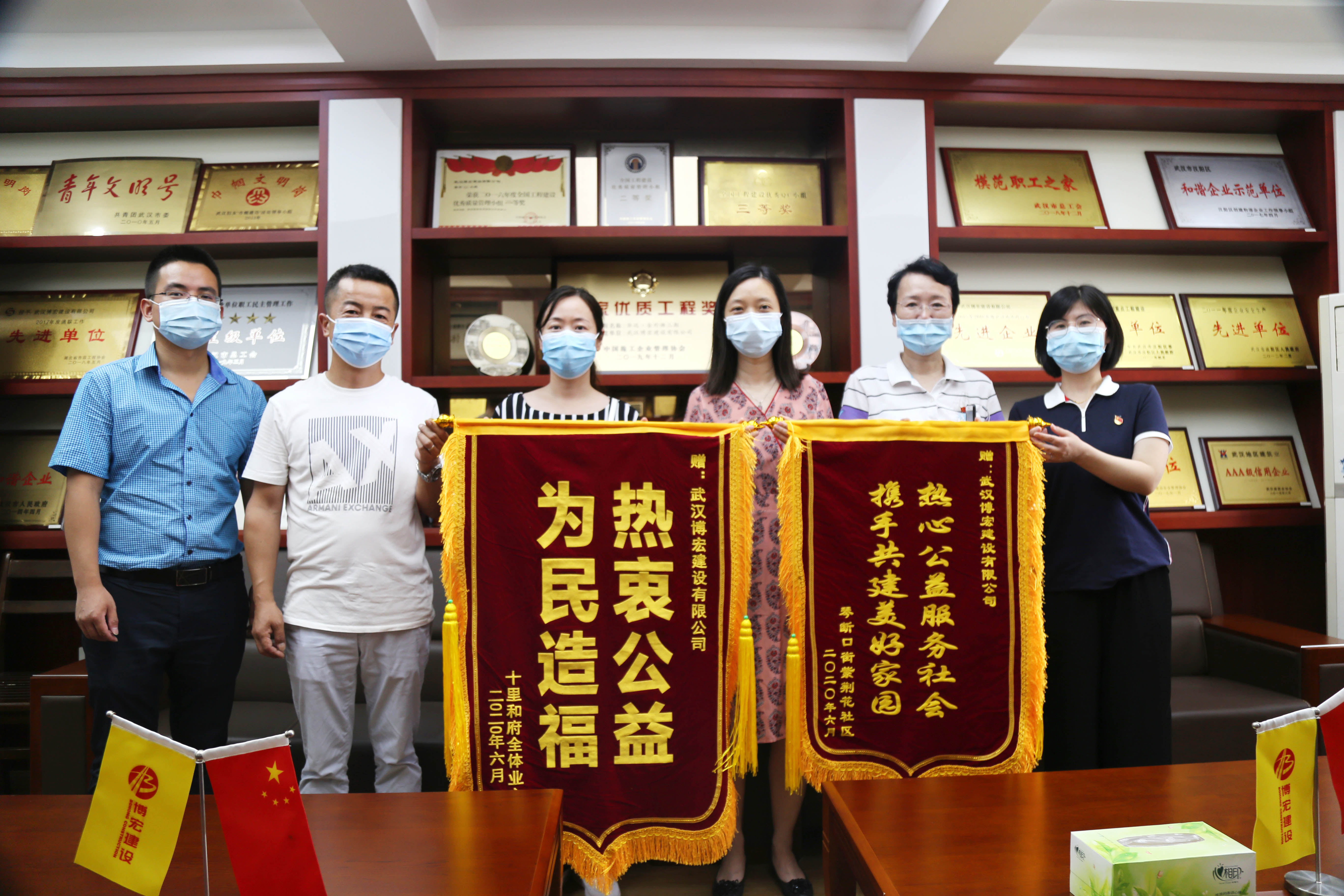 ?? 6月9日上午,漢陽區(qū)委宣傳部代表和漢陽區(qū)紫荊花社區(qū)、十里和府小區(qū)物業(yè)代表結(jié)伴而來,為博宏建設(shè)送來兩面錦旗,感謝博宏建設(shè)在改善社區(qū)工作環(huán)境,服務(wù)社區(qū)公益事業(yè)中做出的努力。據(jù)悉,十里和府小區(qū)一號樓一樓裝修老舊,地面不平,居民出行不便,博宏建設(shè)裝飾裝修項目部在周邊施工時,接到相關(guān)指示,先后派出6人歷時6天,一并對該區(qū)域近300平米進(jìn)行了地磚更換,裝修效果得到了居民和社區(qū)的高度認(rèn)可。