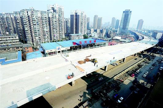 昨日,記者來到雄楚大街改造工程指揮部發(fā)現(xiàn),這里異常繁忙,工人們都在忙著搭腳手架、趕進度。記者看到,雄楚大街高架梅家山立交至武漢理工大學(xué)段橋面已全線貫通,整條高架已成形。對接二環(huán)線珞獅南路高架的接線,正在緊張施工中。施工方介紹,昨日貫通的一段將于今年五一通車。據(jù)了解,二環(huán)線漢陽方面,只剩下龍陽大道墨水湖北路至知音橋段仍在施工中,其他路段均已通車。