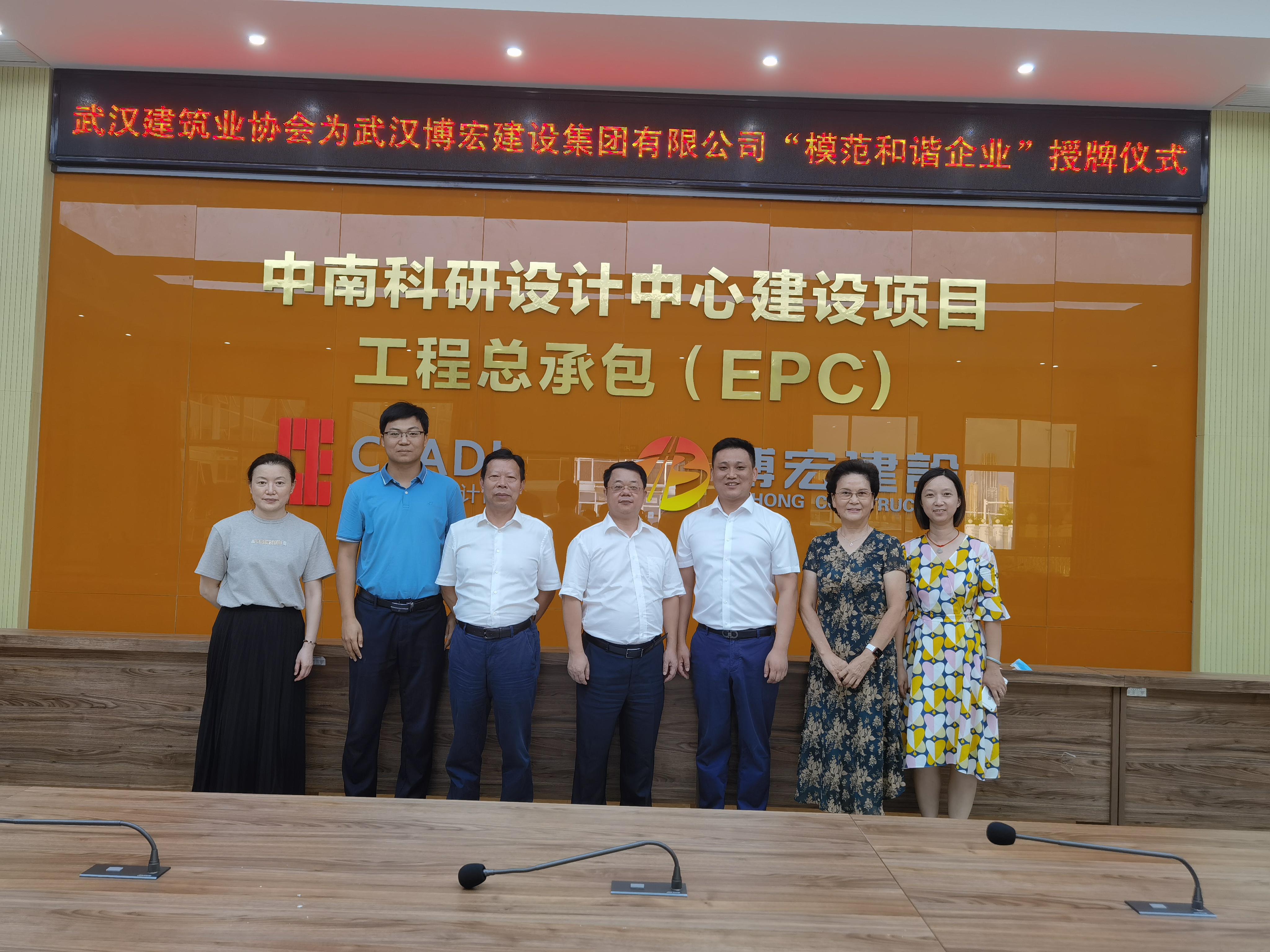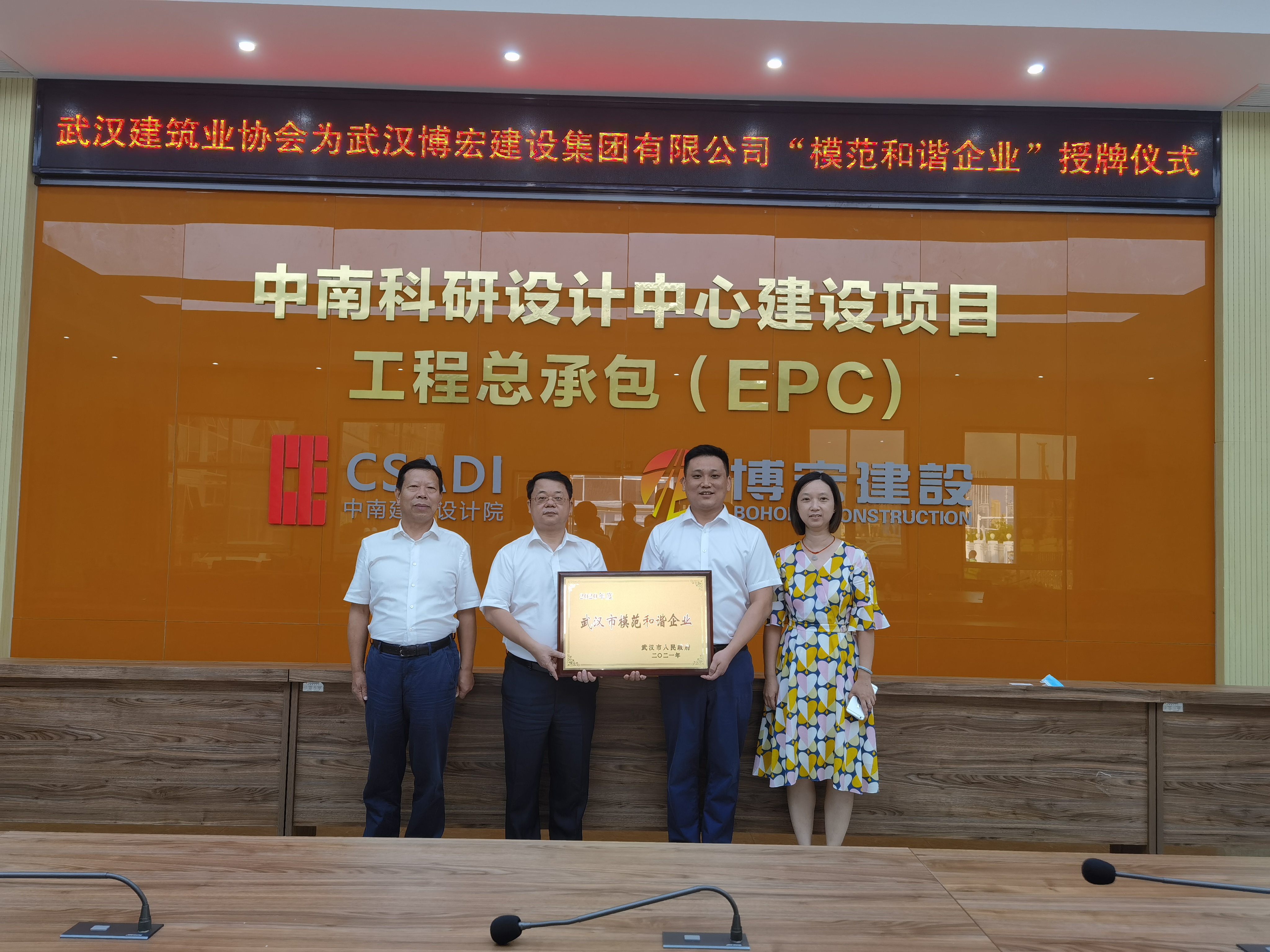 9月14日下午,博宏建設(shè)“武漢市模范和諧企業(yè)”授牌儀式在博宏建設(shè)承建的中南科研設(shè)計(jì)中心項(xiàng)目順利舉行。武漢建筑業(yè)協(xié)會(huì)副會(huì)長劉慶、秘書長李紅青、總工程師工作委員會(huì)副主任安維紅,博宏建設(shè)總經(jīng)理蘇琦、黨支部副書記郭一清、總經(jīng)理助理周昌文參加儀式。
