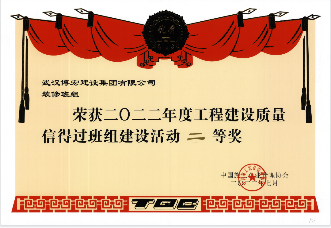 近日,博宏建設(shè)集團裝修分公司榮獲中國施工企業(yè)管理協(xié)會頒發(fā)的2022年度工程建設(shè)質(zhì)量“信得過班組”建設(shè)活動“二等獎”以品質(zhì)工程,打造博宏品牌。