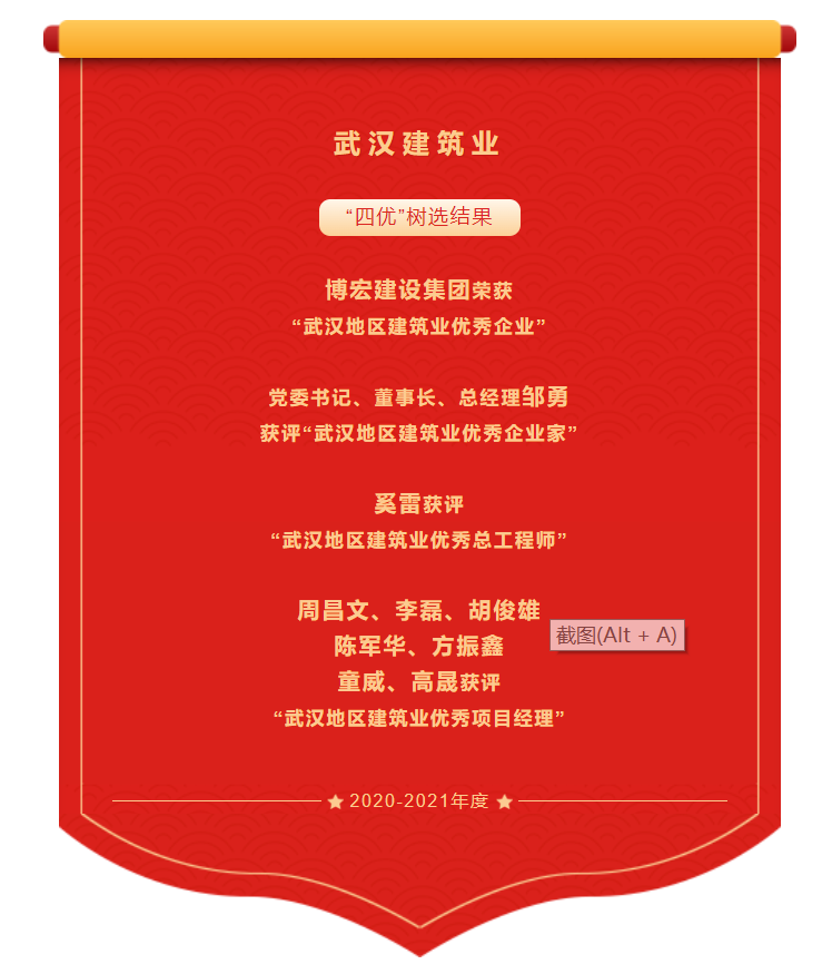 ? ? ? ? 近日,武漢建筑業(yè)協(xié)會(huì)發(fā)布2020-2021年度武漢地區(qū)建筑業(yè)優(yōu)秀企業(yè)、優(yōu)秀企業(yè)家、優(yōu)秀總工程師、優(yōu)秀項(xiàng)目經(jīng)理(以下稱為“四優(yōu)”)選樹結(jié)果。經(jīng)會(huì)員單位自主申報(bào)、協(xié)會(huì)組織專家評審、主管部門復(fù)核、武漢建協(xié)三季度會(huì)長辦公會(huì)審議通過并在協(xié)會(huì)網(wǎng)站進(jìn)行公示,“四優(yōu)”選樹結(jié)果名單火熱出爐。博宏建設(shè)集團(tuán)榮獲“武漢地區(qū)建筑業(yè)優(yōu)秀企業(yè)”;黨委書記、董事長、總經(jīng)理鄒勇獲評“武漢地區(qū)建筑業(yè)優(yōu)秀企業(yè)家”;奚雷獲評“武漢地區(qū)建筑業(yè)優(yōu)秀總工程師”;周昌文、李磊、胡俊雄、陳軍華、方振鑫、童威及高晟獲評“武漢地區(qū)建筑業(yè)優(yōu)秀項(xiàng)目經(jīng)理”。