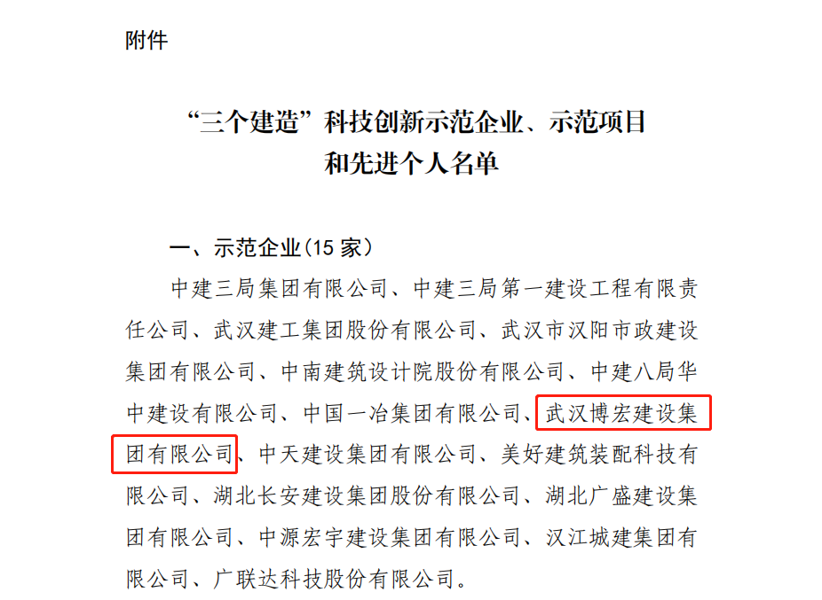 12月28日湖北省住房和城鄉(xiāng)建設(shè)廳發(fā)布關(guān)于綠色建造智能建造品質(zhì)建造科技創(chuàng)新工作情況的通報,博宏建設(shè)集團入選“三個建造”科技創(chuàng)新示范企業(yè);漢陽市政建設(shè)大廈(一標(biāo)段)、新建商務(wù)服務(wù)與設(shè)施項目(中南科研設(shè)計中心)項目入選“三個建造”科技創(chuàng)新示范項目;嚴(yán)俊、楊云華入選“三個建造”科技創(chuàng)新先進個人。