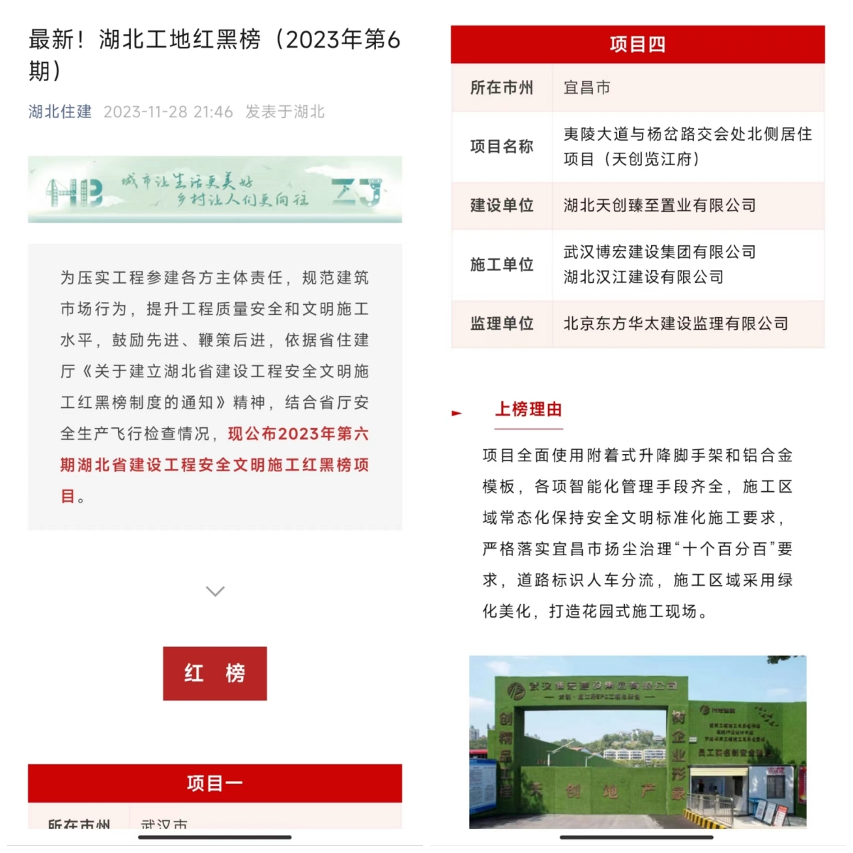 自進(jìn)場施工以來,項目榮登4次宜昌市建筑市場管理紅榜,喜獲宜昌市標(biāo)準(zhǔn)化安薪工地、市安全文明工地等多項榮譽,昨日傳來喜訊:項目喜上加喜,榮登第六期湖北省建設(shè)工程安全文明施工紅榜。