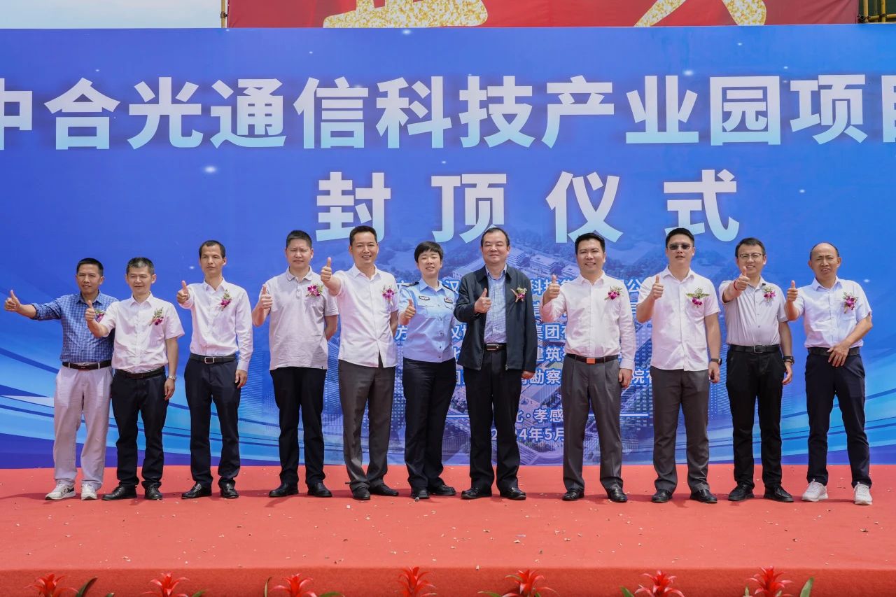 2024年5月9日上午,中合光通信科技產(chǎn)業(yè)園(一期)封頂儀式在項目現(xiàn)場隆重舉行。孝感市人大常委會副主任、臨空區(qū)工委書記邱顯春,孝感市臨空區(qū)工委委員、公安分局局長劉洋,武漢塔子湖集團有限公司黨委書記葉永斌、董事長胡浩,武漢博宏建設集團有限公司董事長鄒勇,武漢中合智能科技集團有限公司董事長李劍出席封頂儀式,共同見證項目封頂。湖北交投耀棟建筑有限公司等參建單位相關領導參加本次儀式。