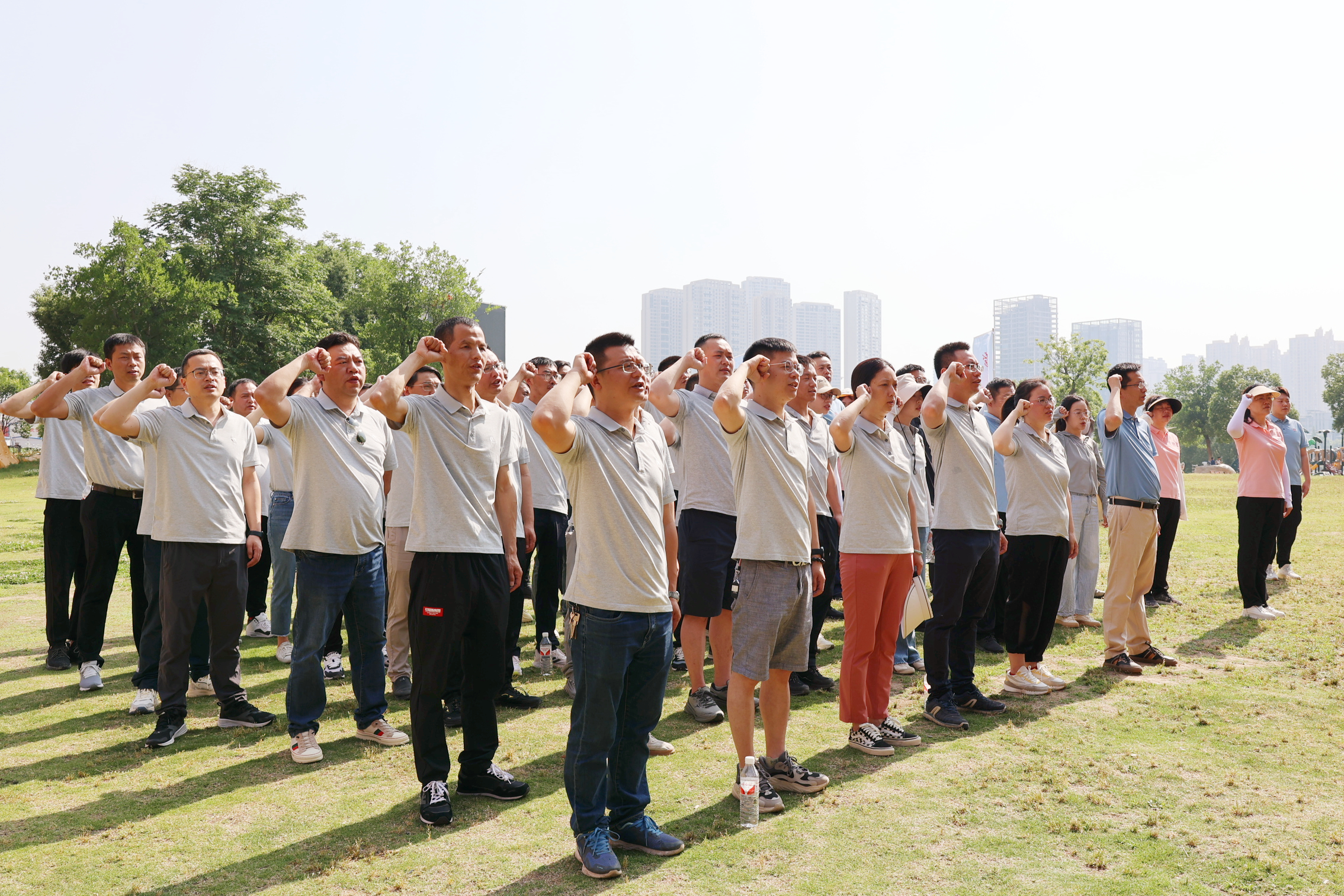 活動現(xiàn)場,全體人員整齊列隊,面對鮮紅的黨旗,高舉右拳,重溫入黨誓詞。