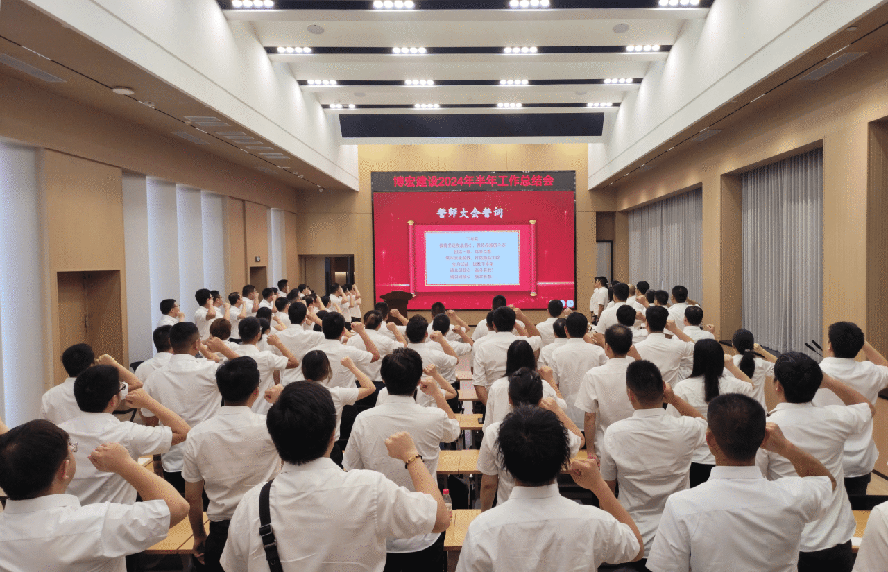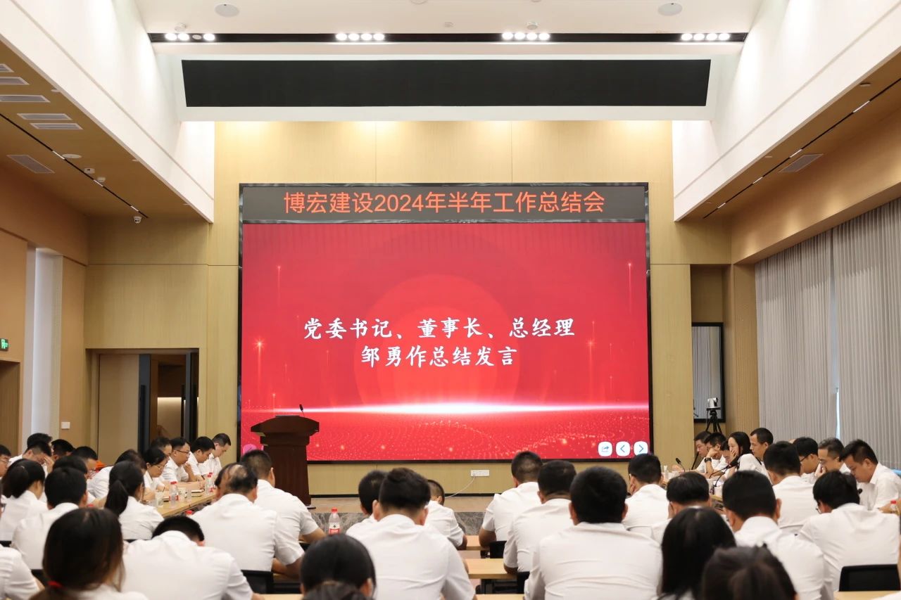 半年總結(jié)蓄新力,錨定目標(biāo)再啟航。7月27日下午,博宏建設(shè)集團(tuán)順利召開2024年半年工作總結(jié)會(huì)。公司黨委班子、總助、部門及項(xiàng)目部負(fù)責(zé)人(含副部長)、項(xiàng)目班子成員(生產(chǎn)經(jīng)理、商務(wù)經(jīng)理、材料員)共計(jì)78人參會(huì)。會(huì)議由黨委副書記郭一清主持。